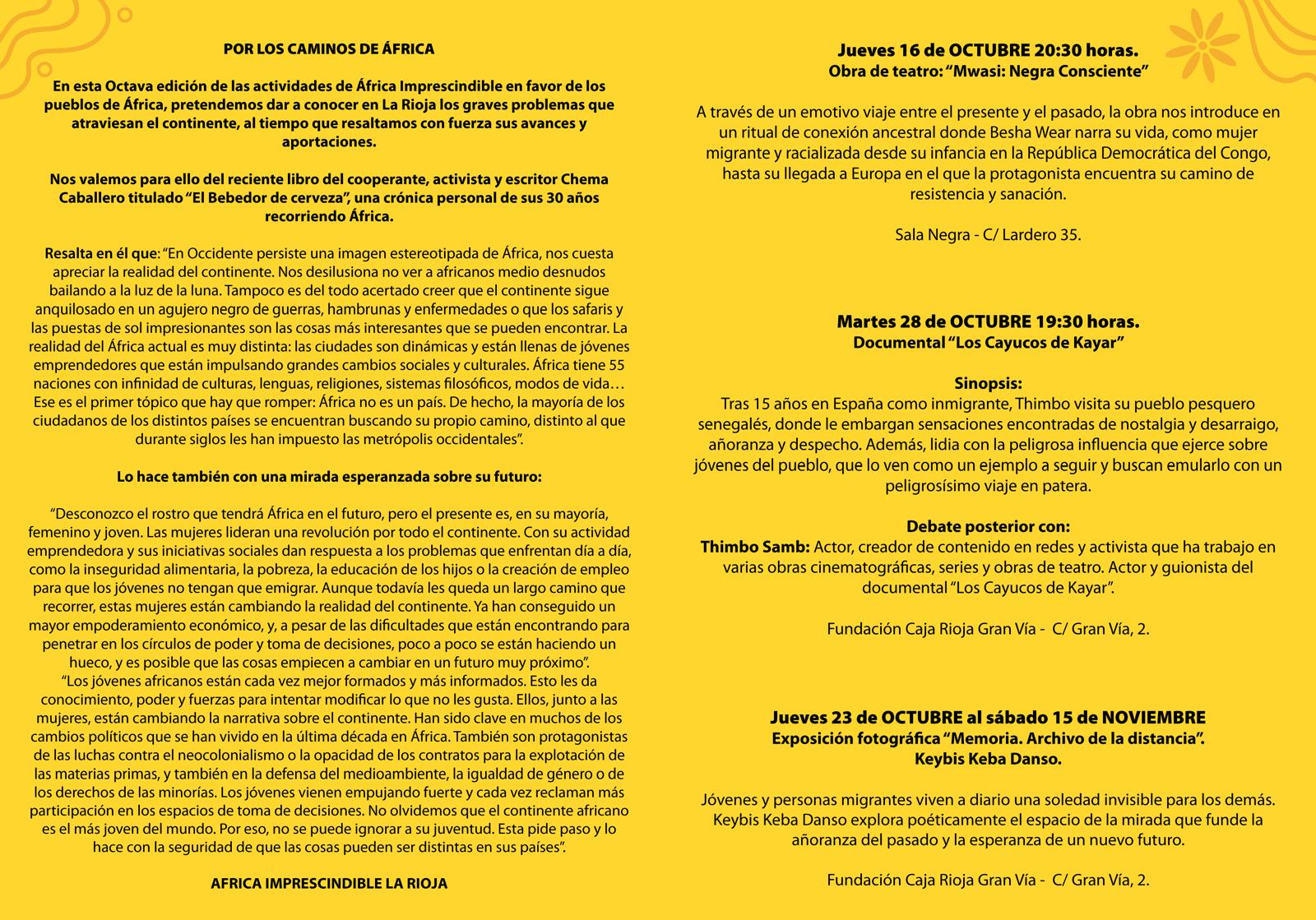 La iniciativa “África Imprescindible La Rioja” regresa este mes de octubre con su VIII edición, consolidándose como un espacio de encuentro cultural, educativo y de sensibilización sobre las realidades, potencialidades y desafíos del continente africano.