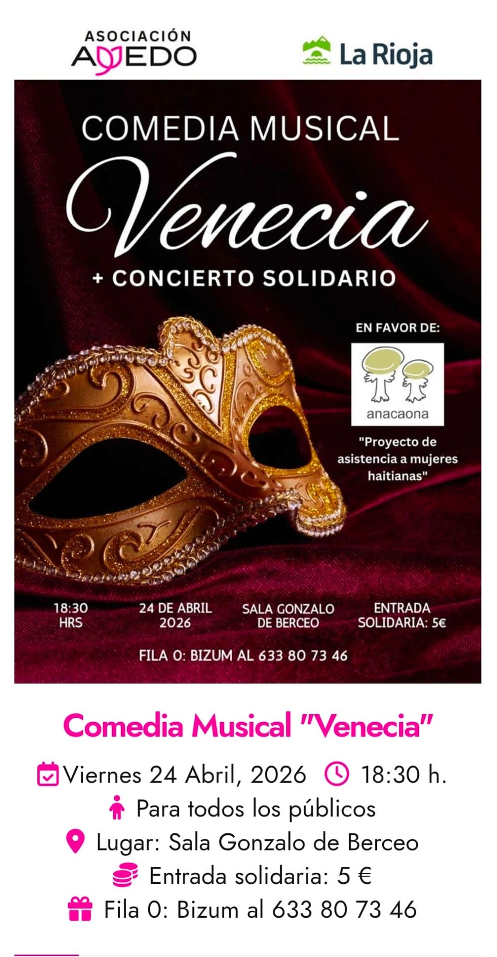 La Sala Gonzalo de Berceo será el escenario, el próximo 24 de abril a las 18:30 horas, de una iniciativa cultural y solidaria impulsada por la asociación Ayedo. El evento combinará la representación de la comedia musical “Venecia” con un concierto solidario, en una cita que une arte y compromiso social.